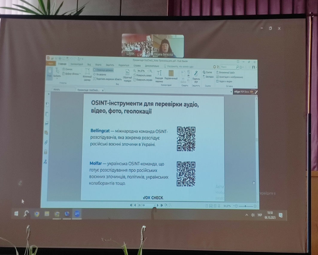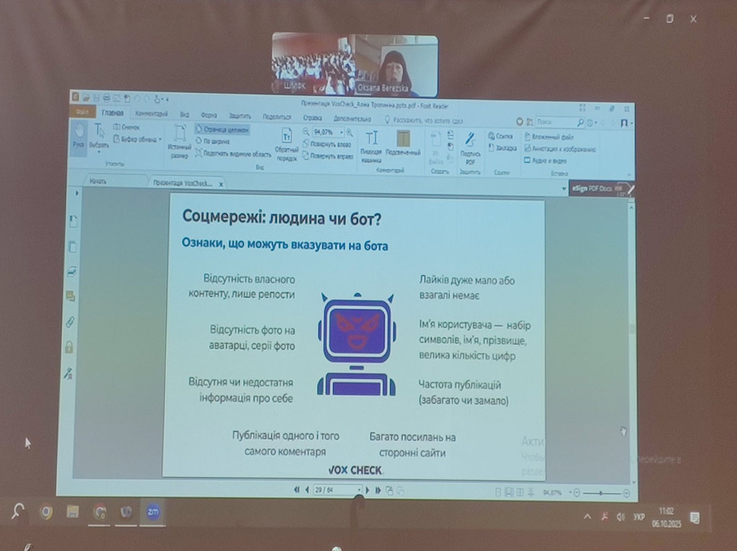 06 жовтня.2025 року в стінах коледжу відбувся онлайн-тренінг із фахівцем Хмельницького медіаклубу Оксаною Березською на тему «Елементи системи фактчекінгу в структурі захисту особистого та професійно-орієнтованого простору», який зібрав здобувачів освіти І–ІІ курсів ОП/ОПП Лікувальна справа, Сестринська справа, Профілактична стоматологія, Стоматологія ортопедична та Фармація.